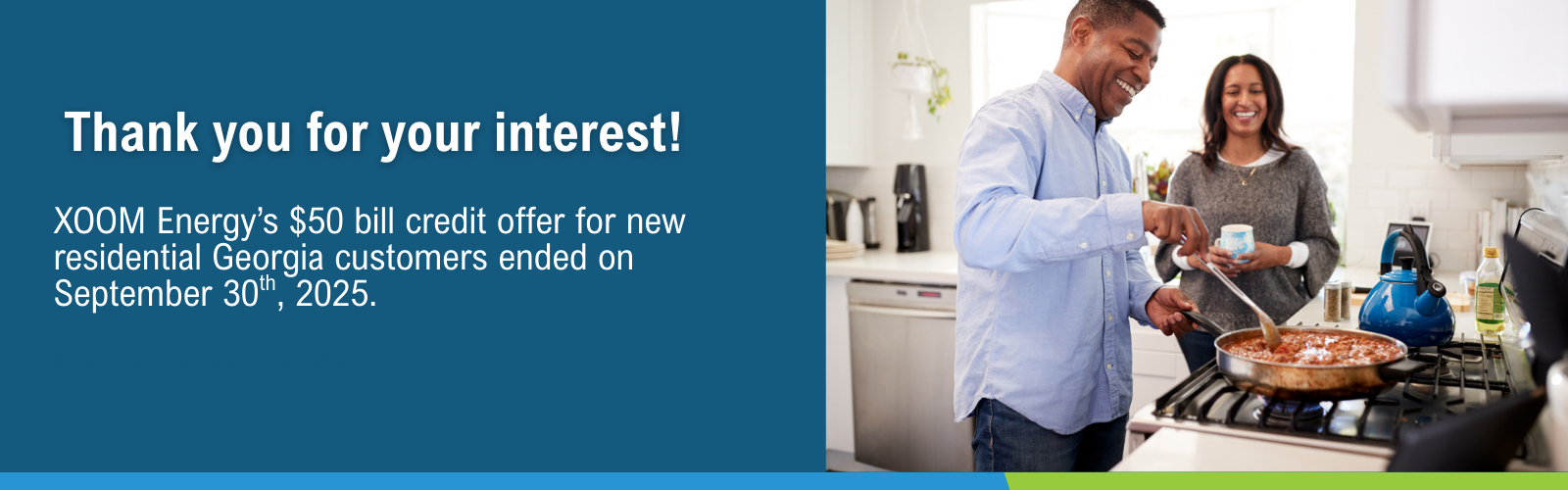 *Limited time offer. The $50 bill credit is a one-time promotional offer only for first-time residential natural gas customers in Georgia who enroll on a fixed-rate plan 12 months or longer. Additional eligibility requirements, terms and restrictions may apply. Please see our Terms of Service for full details, which can be found on online in the Product Details section of each plan and in your Welcome Email/Letter. Previous customers or existing customers are not eligible. The bill credit cannot be redeemed for cash or transferred to another account. The $50 credit will be applied to the total amount of your third bill of the contract term and additional bills until the credit is exhausted. Residential customers must have an active natural gas service account with XOOM Energy at the time of bill credit fulfillment. Active customers are defined as those qualifying accounts that (i) bill usage is greater than zero. (ii) for which we have not received a request to discontinue service or change plans. XOOM Energy may discontinue this offer at any time without prior notice.